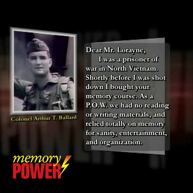“I was a PRISONER OF WAR in North Vietnam from September 26th, 1966 until March 4th, 1973. Shortly before I was shot down and captured I learned your MEMORY POWER systems. The prisoners of war had no reading or writing material, so we relied solely on memory for sanity, entertainment, names of other POWs, military directives and orders. During the first months of captivity, while flat on my back in a cast, I applied your systems for my own benefit, and it indeed worked! I then taught it to hundreds of my fellow POWs over the next six years. Eventually it was spread throughout the camp and was an invaluable aid to all of us. Academic classes were conducted by POWs entirely from memory. We applied your methods and learned literally thousands of foreign words, poems, speeches, mathematics, electronics, classical music, philosophy, biology – the list is endless. This opened new worlds of mental activity which was so important to us since we were isolated from the world for such a long period of time. I am deeply indebted to you for your memory techniques and for sharing them with the public. I needed to tell you how much your work meant to all of us behind the bamboo wall. Most Sincerely. (Col. Ballard [Ret.] told this story on the television show To Tell the Truth. He went on to teach Harry Lorayne’s memory techniques in South Carolina .)”
